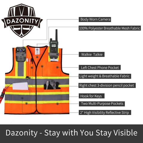 - MULTI-FUNCTION POCKETS: This Safety Vest comes with 7 Front Pockets, you can have Most of mobile phone, flashlight, laser pointer. Mic-Clip Holder ,Tape measure etc in the pockets, There are 2 Strips for Body Worn Camera & Walkie Talkie. One Pocket for Name or ID Card